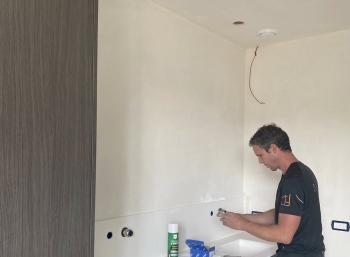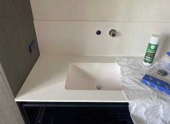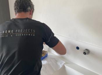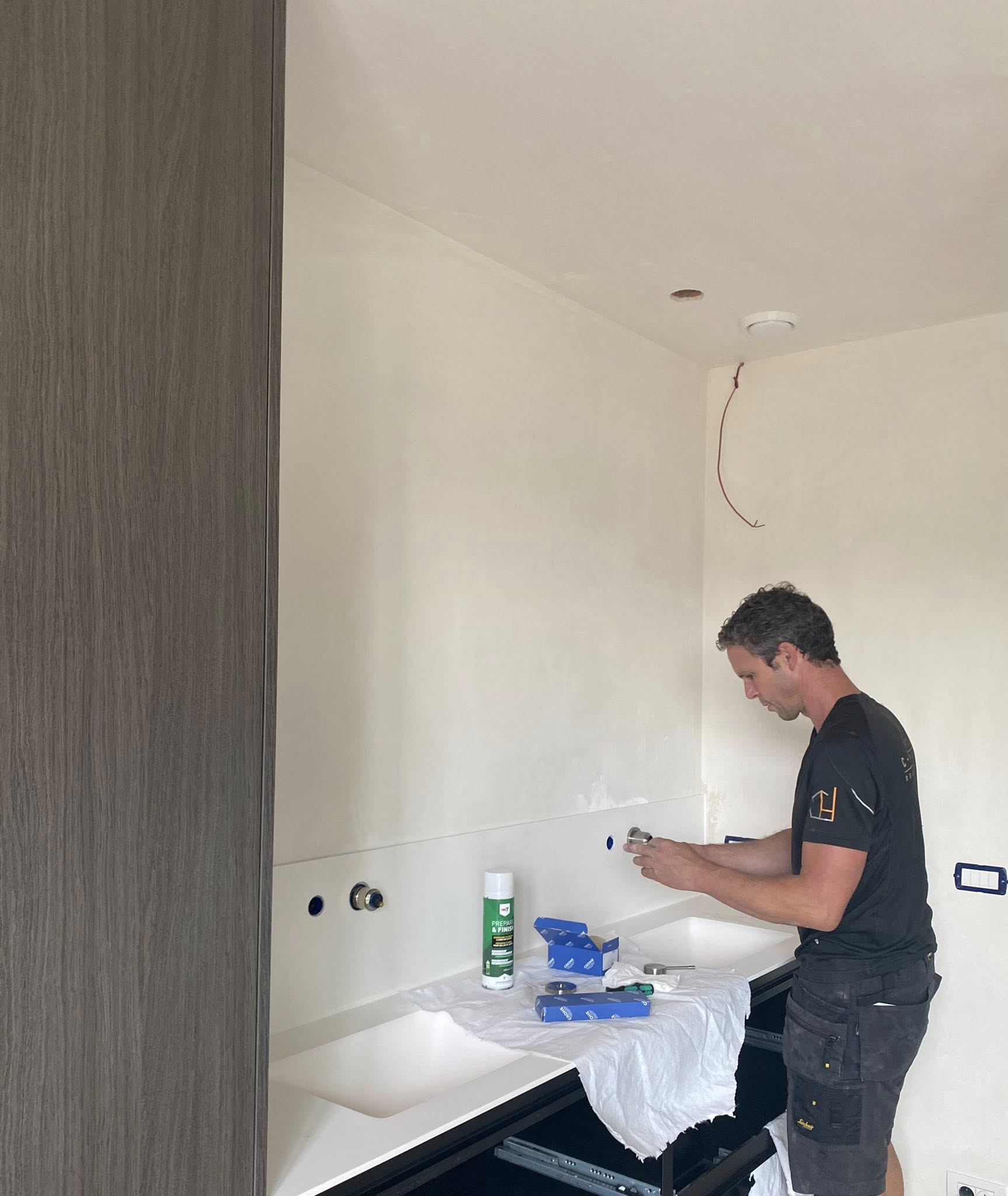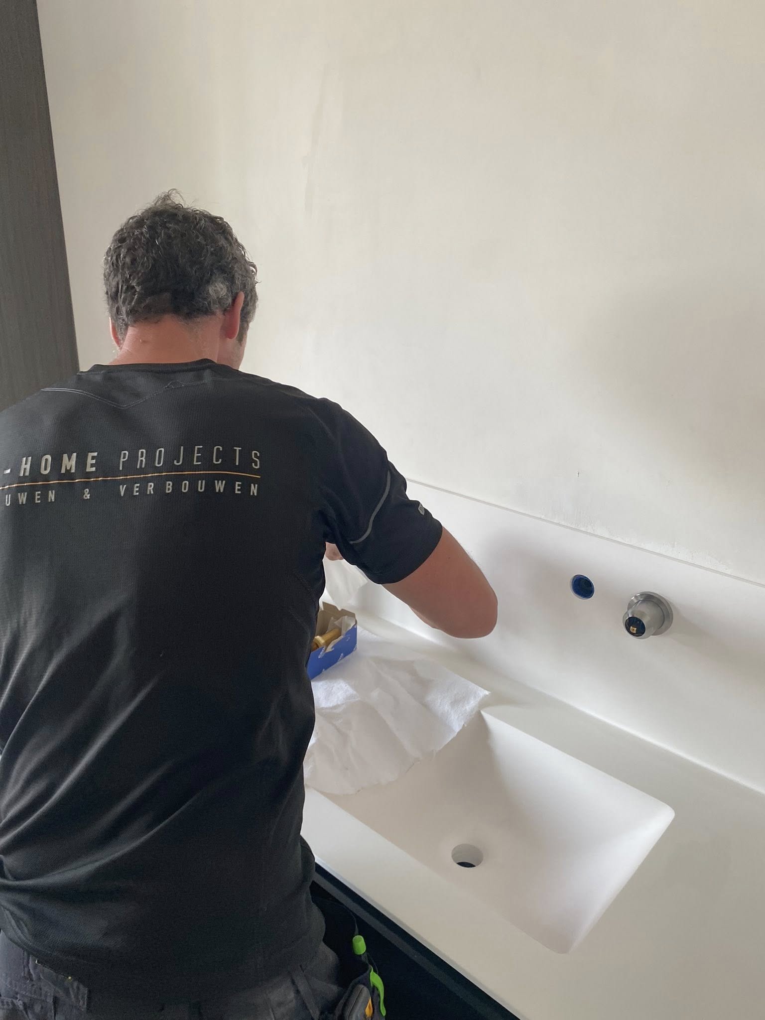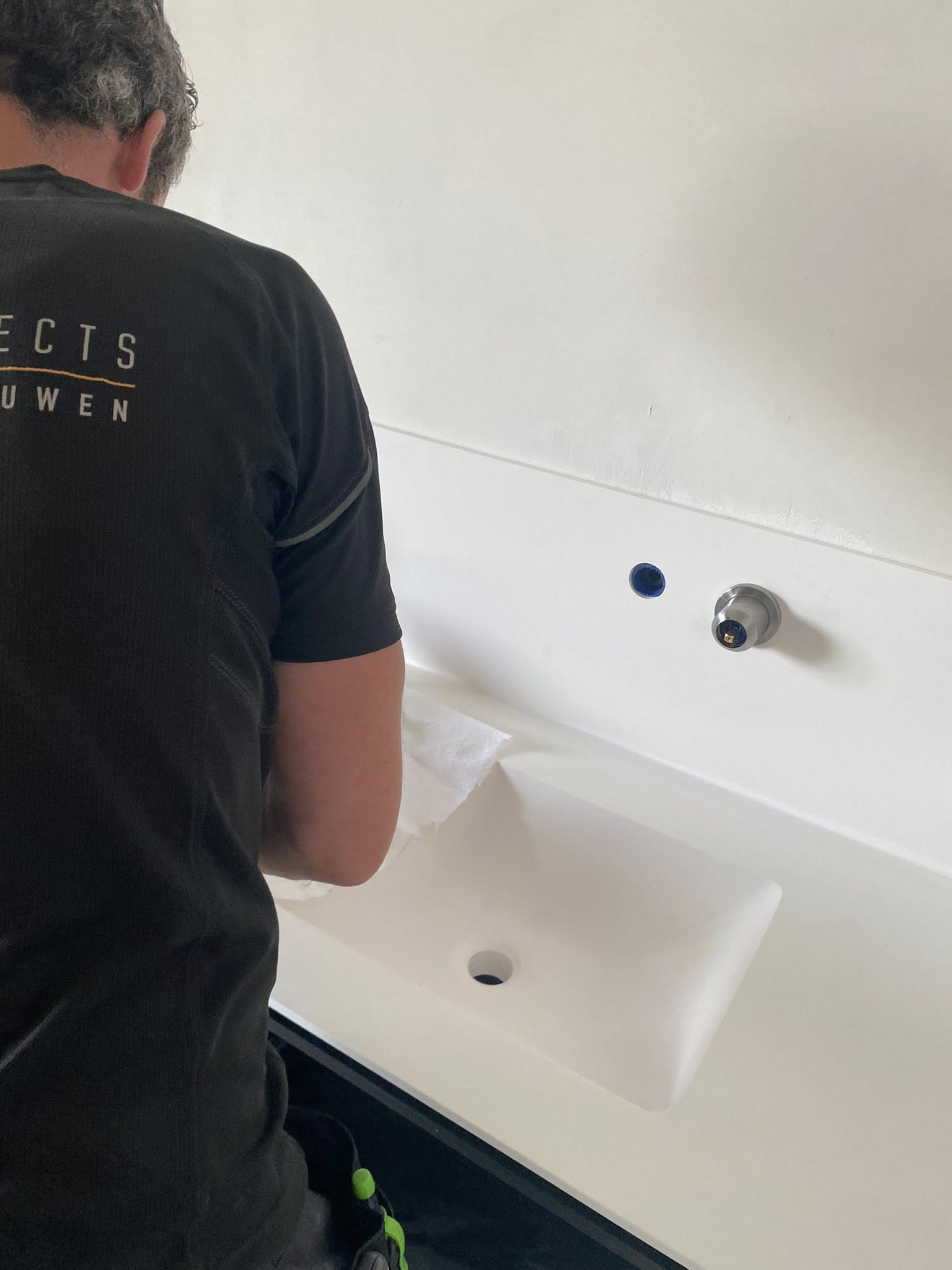 Badkamer St. Idesbald / wastafels en bad in Solid Surface, maatwerk laminaat Nevis Oak, inbouwkraanwerk rvs